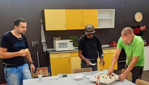 Tussen de bedrijven neemt Marcel Heuterman, eigenaar van Wimaplant de GelreWerkt!-taart in ontvangst. ‘Een taart om te bedanken voor de start van een fijne samenwerking en het feit dat Fred en Martijn een arbeidsovereenkomst op zak hebben’, aldus een enthousiaste Irmgard van der Linden, accountmanager bij GelreWerkt!.
